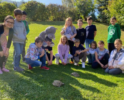 Zwei griechische Landschildkröten konnten die Schüler*innen der 4. Klasse am Welttierschutztag besuchen und beobachten.
