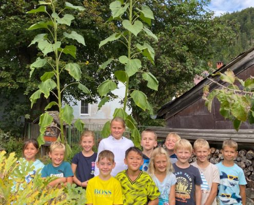 2 unserer eingesetzten Sonnenblumenkerne haben es geschafft und sind sehr groß geworden. Hoffentlich freuen sich die Vögel im Winter über den Futterplatz.